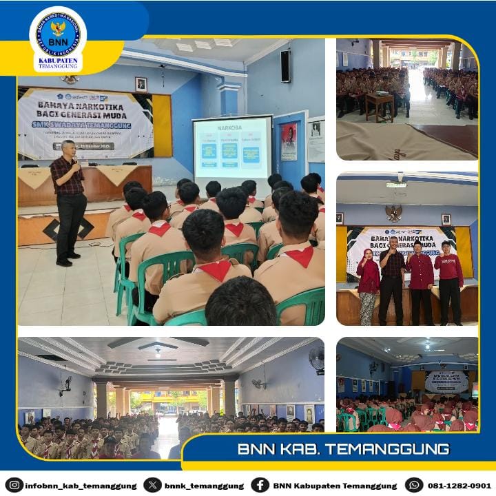 Kategori Kategori: Bersih Narkoba (Bersinar) 22 Oktober 2025 07:23:00 9 Pelatihan dan Pembekalan Remaja Teman Sebaya Anti Narkoba Desa Lungge Temanggung Selengkapnya Kategori: Bersih Narkoba (Bersinar) 22 Oktober 2025 07:22:00 10 Program Intervensi Ketahanan Keluarga Desa Lungge Kab.Temanggung Selengkapnya Kategori: Pencegahan dan Pemberdayaan Masyarakat 23 Oktober 2025 07:20:00 12 Kegiatan Sosialisasi P4GN kepada Siswa-siswi SMK Swadaya Temanggung Selengkapnya Kategori: Bersih Narkoba (Bersinar) 15 Oktober 2025 09:17:00 15 Kegiatan Sosialisasi P4GN di SMP Negeri 3 Kandangan Temanggung Selengkapnya Kategori: Rehabilitasi 10 Oktober 2025 08:54:00 15 Penilaian Pascarehabilitasi Klien IBM Selengkapnya Kategori: Rehabilitasi 10 Oktober 2025 08:53:00 10 Konsultasi Layana Rehabilitasi Selengkapnya Kategori: Rehabilitasi 10 Oktober 2025 08:52:00 26 Layanan Bina Lanjut IBM Selengkapnya Kategori: Pencegahan dan Pemberdayaan Masyarakat 10 Oktober 2025 08:51:00 6 SOSIALISASI P4GN MELALUI PENAMPILAN BAND SATKER BNNK TEMANGGUNG DALAM ACARA FESTIVAL LITERASI PELAJAR SE KABUPATEN TEMANGGUNG Selengkapnya Kategori: Pencegahan dan Pemberdayaan Masyarakat 11 Oktober 2025 08:50:00 15 Kegiatan Sosialisasi P4GN kepada siswa SMP N 4 Temanggung Selengkapnya Kategori: Rehabilitasi 13 Oktober 2025 08:49:00 8 Terminasi Program Rehabilitasi Selengkapnya Kategori: Rehabilitasi 14 Oktober 2025 08:48:00 19 HOME VISIT LAYANAN PASCAREHABILITASI Selengkapnya Kategori: Rehabilitasi 15 Oktober 2025 08:47:00 8 HOME VISIT LAYANAN PASCAREHABILITASI Selengkapnya FirstPrev45678NextLast