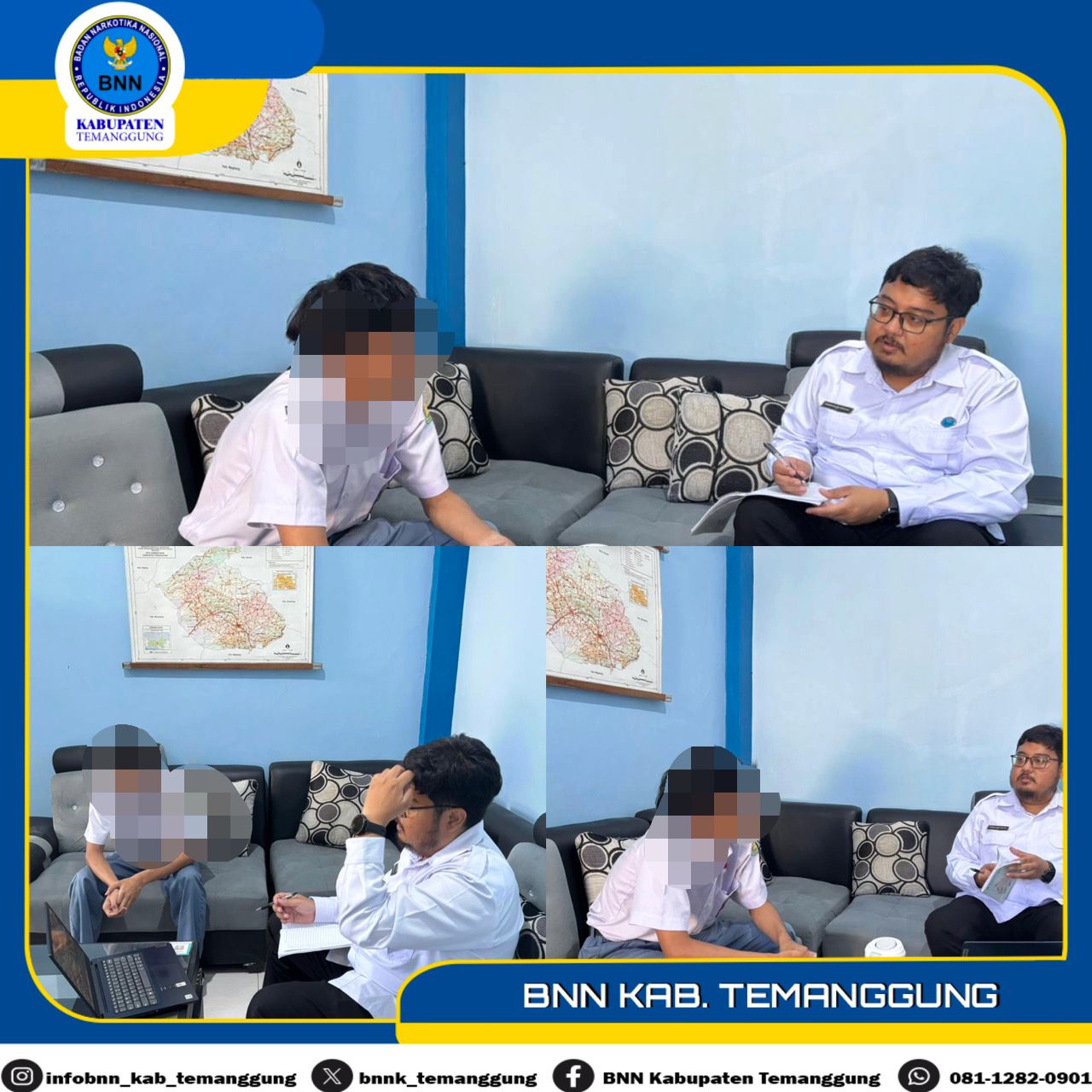 Pada hari Senin tanggal 13 Oktober 2025, BNN Kabupaten Temanggung melalui petugas Seksi Rehabilitasi / Klinik Pratama BNNK Temanggung melakukan terminasi terhadap klien J/19 th/L yang mengikuti rehabilitasi rawat jalan di Klinik Pratama BNNK Temanggung. Hal ini karena klien sudah menyelesaikan program rehabilitasi. Pada kesempatan ini, petugas melakukan konseling akhir. Kemudian dilakukan evaluasi akhir berupa pengisian instrumen ASI post, WHOQOL, URICA, dan pemeriksaan urine. Rencana tindak lanjut yaitu rujukan layanan pascarehabilitasi / bina lanjut.